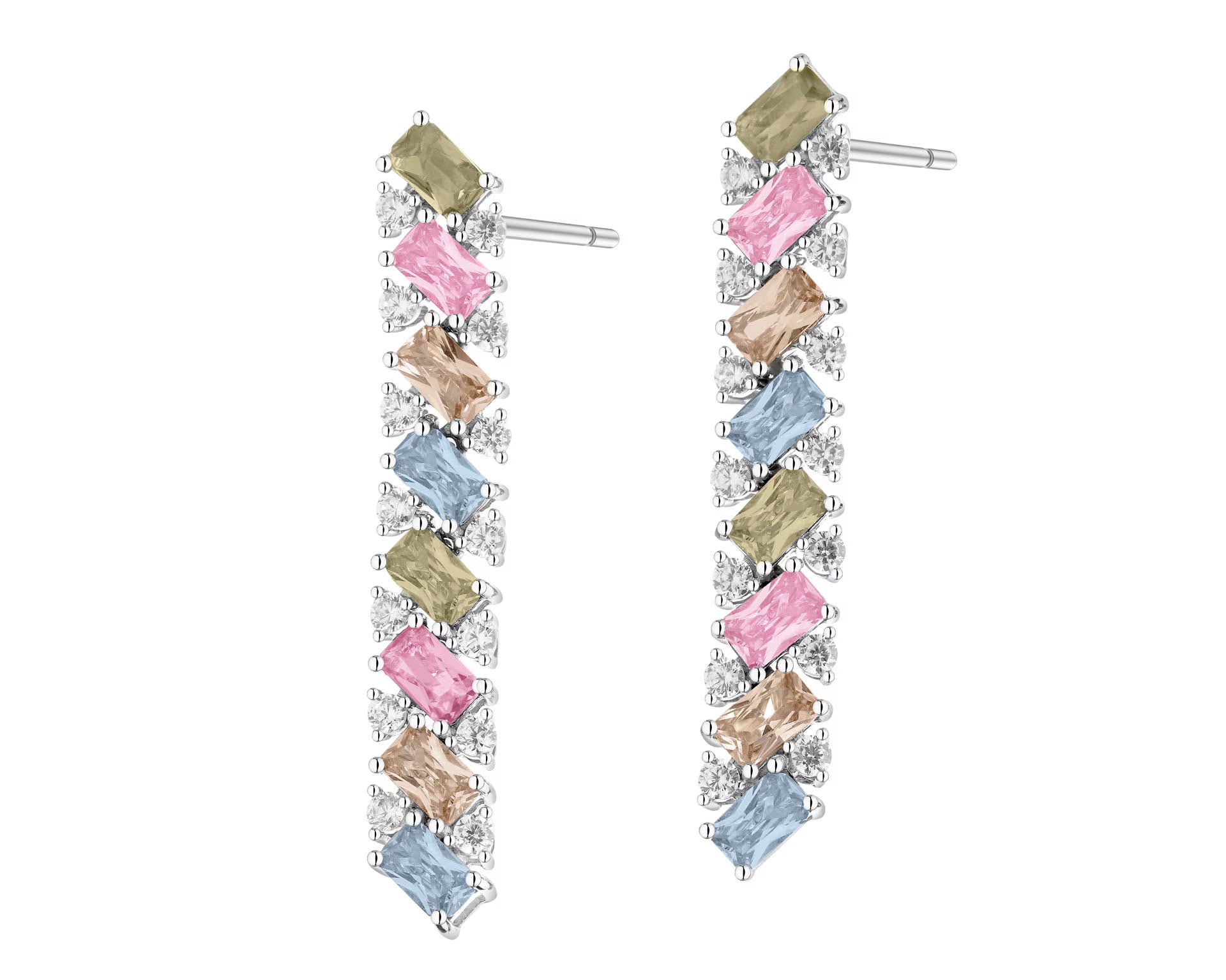 Eleganckie wiszące kolczyki wykonane z rodowanego srebra próby 925, zdobione błyszczącymi cyrkoniami. Długość 40 mm zapewnia efektowny wygląd, zachowując jednocześnie lekkość i komfort noszenia.